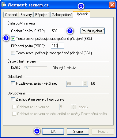 Dále klikneme na záložku „Upřesnit“ a do kolonky Odchozí pošta (SMTP) napíšeme číslo 587 (lze použít i 465).
